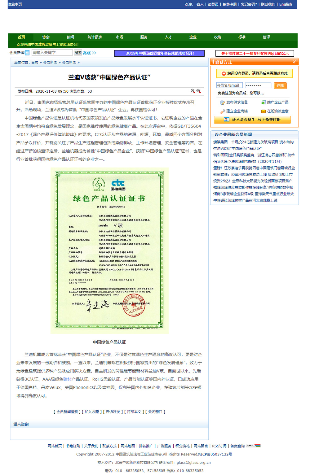 建筑玻璃与工业玻璃协会:《尊龙凯时平台入口V玻获“中国绿色产品认证”》